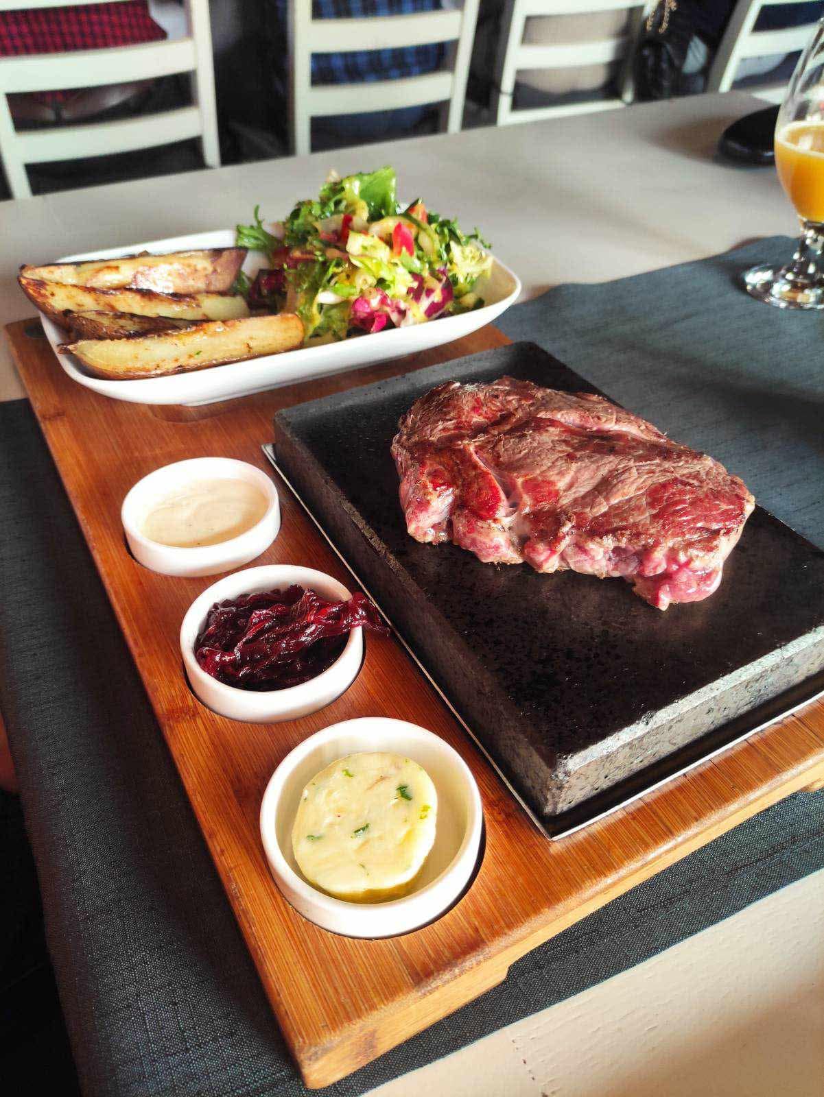 na kamieniu lawowym, marynowana w czosnku niedźwiedzim, ziemniaki grillowane, mix sałat